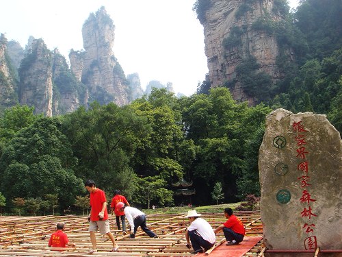2008中國湖南國際旅游節(jié)開幕式舞臺(tái)位于世界自然遺產(chǎn)張家界國家森林公園老磨灣,根據(jù)導(dǎo)演組的舞臺(tái)美術(shù)設(shè)計(jì),分為主體演出舞臺(tái)和方陣舞臺(tái),總面積1600多平方米,總共將容納1600人同臺(tái)演出。其中主體舞臺(tái)長40米、深度為31.5米、高1.5米,方陣舞臺(tái)為42米長、深度9.5米、最高達(dá)10.5米的弧型階梯式舞臺(tái)。整個(gè)工程共需要使用25噸左右的鋼管,舞臺(tái)表面每平方米能夠承重600公斤以上。