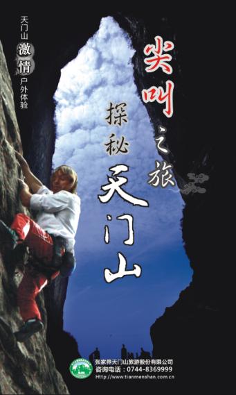 2008年9月,天門山景區(qū)全新推出“尖叫之旅,探秘天門山”戶外體驗(yàn)項(xiàng)目。項(xiàng)目?jī)?nèi)容包括懸崖速降,星光露營(yíng),極限攀巖,野外燒烤,戶外拓展等,所有體驗(yàn)項(xiàng)目均由曾擔(dān)任過法國(guó)蜘蛛人阿蘭·羅伯特陪練的國(guó)內(nèi)資深戶外教練親自操練并全程指導(dǎo)。