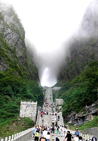 選擇乘索道游覽天門山是最佳視角。索道吊廂一出站房,馬上就騰空飛了起來,從城市的一棟棟樓頂掠過,猶如在城市上空滑翔。翻過一道山梁之后,城市被遠(yuǎn)遠(yuǎn)拋在了視線以外,大片翠綠的稻田映入眼簾,透過打開的通風(fēng)窗口,一陣陣青草水田特有的清香沁入心脾。或高或低的農(nóng)舍不時(shí)從我們身下滑過,牛羊們?nèi)齼蓛捎崎e的在田間浮動(dòng)著,靜謐、安詳。再翻過一座山峰,我們便立即被滿山的青翠所包圍,萬(wàn)仞絕壁也已投懷送抱。索道支架矗立于絕壁天險(xiǎn)中,或挺立或傾倒或探頭或擁抱,我們繼續(xù)在艱險(xiǎn)中游歷,時(shí)而隱沒于云堆,時(shí)而出世于蒼穹。這時(shí)你除了那滿懷的驚險(xiǎn)刺激外有的便只有望索而興嘆了。我拍了很多片子,但是總覺得還是沒有足以記錄下來這座空中盆景的壯麗。