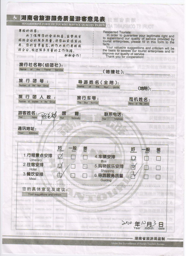 合肥陳蘭鋒一行6人旅游質量回饋表