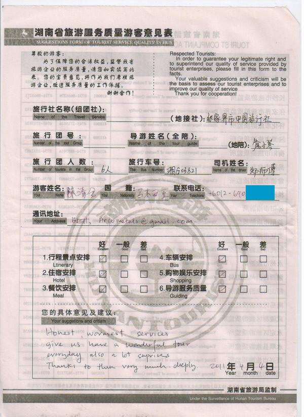 馬來西亞陳先生一行6人旅游質(zhì)量回饋