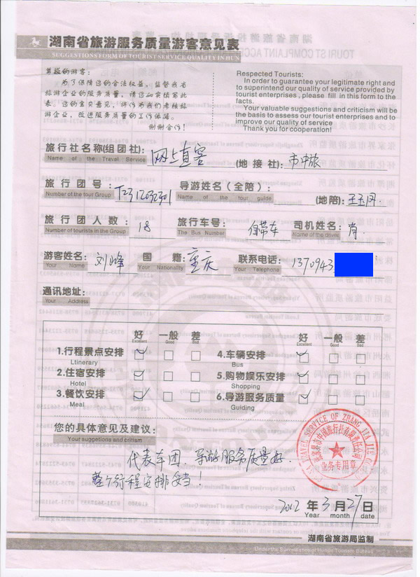 重慶劉先生一行18人旅游質量回饋