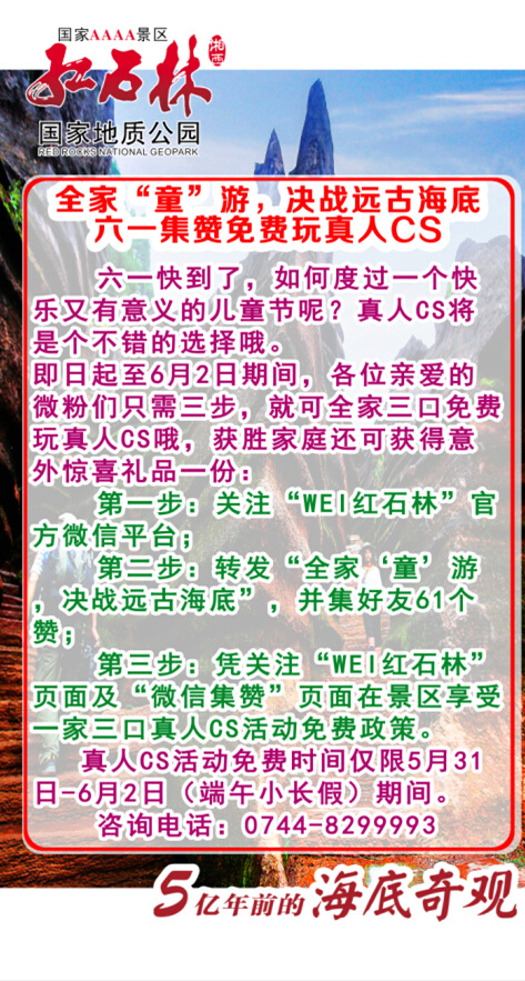第三步:憑關(guān)注“WEI紅石林”頁面及“微信集贊”頁面在景區(qū)享受一家三口真人CS活動免費政策。