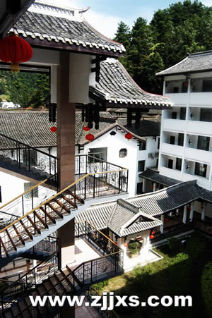 ·考慮到“不與山爭(zhēng)名,不與山爭(zhēng)高,不與山比美,不喧賓奪主,以建筑從屬環(huán)境,與環(huán)境之協(xié)調(diào)統(tǒng)一而突出山之自然景觀”這一宗旨,該實(shí)際運(yùn)用中國(guó)傳統(tǒng)式庭園層層院落深進(jìn)的布局,是一所多庭院的建筑群。它的門面小巧別致而院落深遠(yuǎn)寬闊,配有花圃水榭亭臺(tái)樓閣,頗具典型湘西土家“白墻、青瓦、紅柱、翹檐、吊腳”的民居風(fēng)格,與張家界森林公園景區(qū)的奇山座座、異峰排排、萬(wàn)木蔥蔥的風(fēng)光景象和諧統(tǒng)一。它古色古香的韻味也與張家界風(fēng)景集“幽、野、神、奇、秀”為一體的特點(diǎn)所融匯。