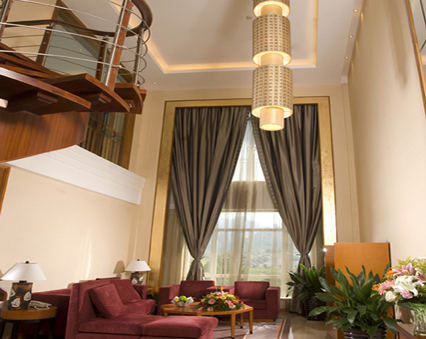 樓中樓套房:面積118平米?蛷d寬敞高挑,超大衛(wèi)生間,時尚的設(shè)計讓房間的通風、采光及日照達到極限,窗外可看到百丈峽風景。