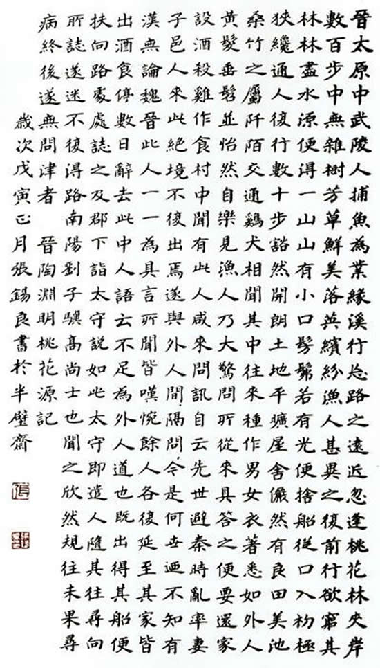 晉太元中,武陵人,捕魚為業(yè)。緣溪行,忘路之遠近,忽逢桃花林。夾岸數(shù)百步,中無雜樹,方草鮮美,落英繽紛。漁人甚異之,復前行,欲窮其林。林盡水源,便得一山。山有小口,仿佛若有光。便舍船從口入,初極狹,才通人。復行數(shù)十步,豁然開朗。土地平曠,屋舍儼然,有良田美池桑竹之屬,阡陌交通,雞犬相聞。其中往來種作,男女衣著,悉如外人。黃發(fā)垂髫,并怡然自樂。見漁人,乃大驚,問所從來,具答之。便要還家,設酒殺雞作食。村中聞有此人,咸來問訊。自云先世避秦時亂,率妻子邑人,來此絕境,不復出焉,遂與外人間隔。問今是何世,乃不知有漢,無論魏晉。此人一一為具言所聞,皆嘆惋。馀人各復延至其家,皆出酒食。停數(shù)日,辭去。此中人語云:“不足為外人道也”。既出,得其船,便扶向路,處處志之。及郡下,詣太守說如此。太守即遣人隨其往,尋向所志,遂迷,不復得路。南陽劉子驥,高尚士也,聞之,欣然規(guī)往,末果,尋病終。后遂無問津者。