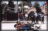 (2)臥刀破石:先固定兩把大刀,刀口朝上,臥刀者運(yùn)氣后,由其他人抬臥于刀口上(有仰臥、俯臥兩種),然后在臥刀者腹部或背部置一碩大石條(約數(shù)百斤),由一個或兩個彪形大漢掄大錘狠擊石條直至斷裂破碎為止。