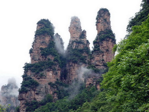聳立著的三座灰白色的石峰,人稱“三姐妹峰”。每座峰高100多米,上小下大,形似三個(gè)穿著花羅裙的苗族少女。她們立在山梁上,亭亭玉立,若有所思,真是神形兼?zhèn)。相傳這是三個(gè)苗姑站在山梁上與情郎對(duì)唱情歌,她們情真意切,在這里唱了三天三夜的苗歌。后來(lái)天上出現(xiàn)七個(gè)日頭,把大地曬裂口了,把樹木曬枯了,把河水曬干了,把她們?nèi)齻(gè)人哩,燒化為石頭了。