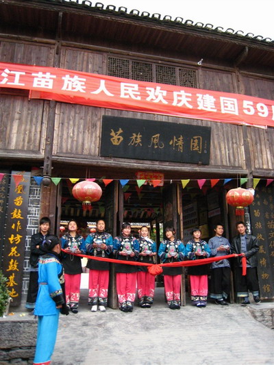 稱山江為總兵營則源于清朝鎮(zhèn)壓苗民起義時(shí)在此駐兵設(shè)過總兵營房。至于叫“山江”則因解放后在寨西北山上修了座山江水庫,苗寨缺水、水庫修成后觀者如潮,人們稱“叭固”為山江,久之,行政區(qū)名便隨之改為“山江”。山江,保留著古老的苗家習(xí)俗。鮮麗奪目的苗族服飾,情調(diào)別致的攔門酒,風(fēng)格獨(dú)特的卡鼓、攔路歌、邊邊場(chǎng),會(huì)使你耳目一新,如癡如醉;還有傳統(tǒng)節(jié)日“四月八”的跳月跳花,“六月六”的山歌對(duì)唱,又會(huì)使您心動(dòng)神搖,嘆為觀止。游鳳凰不到山江,你將終生遺憾。苗族服飾最具特色是女裝。出門時(shí),頭上戴著青絲帕,身上穿著滾邊繡花無領(lǐng)滿襟,滾邊繡花褲;頭帕和上衣綴滿銀飾,有銀帽、銀鳳冠、銀項(xiàng)圈、銀手鐲、銀戒子、銀牙釬、銀掛鏈、銀腰帶等,雍容華貴,落落大方。山江女裝,衣著色彩鮮麗,銀飾造型精美,是苗族女裝的精品。攔門酒是苗家古老的習(xí)俗,一些地方直呼“識(shí)友酒”。