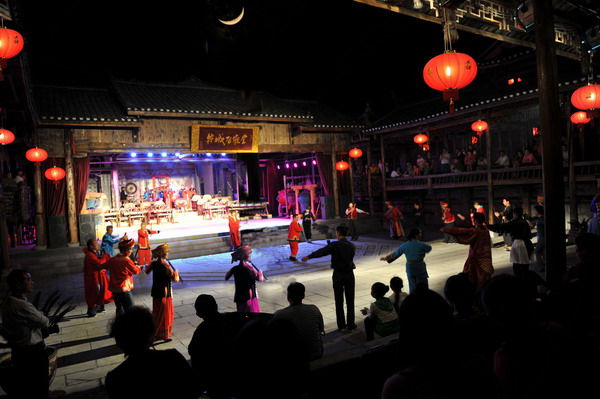 沒走幾步,一支帶著童音的歌聲,從一座木板庭院里傳出,幽雅,張揚,我們循聲走進這棟老屋,庭院里居然是一處表演場,一個小姑娘握著話筒在舞臺上一邊歌唱,一邊表演。這邊觀眾臺前端莊地坐著幾位帶有藝術(shù)氣質(zhì)的中年人,他們在細(xì)語,像是在評判著那個姑娘的姿態(tài)和演唱。